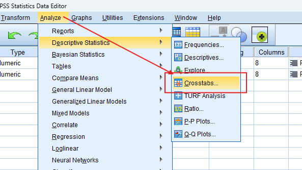 In the top menu, click on Analyse > Descriptive Statistics > Crosstabs.