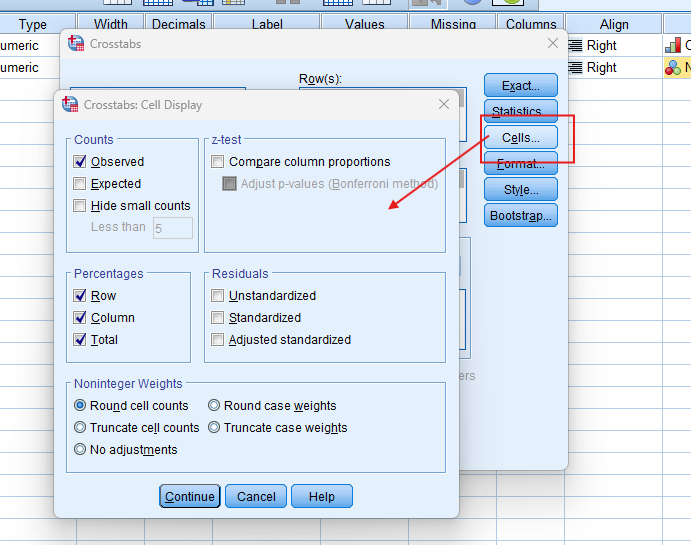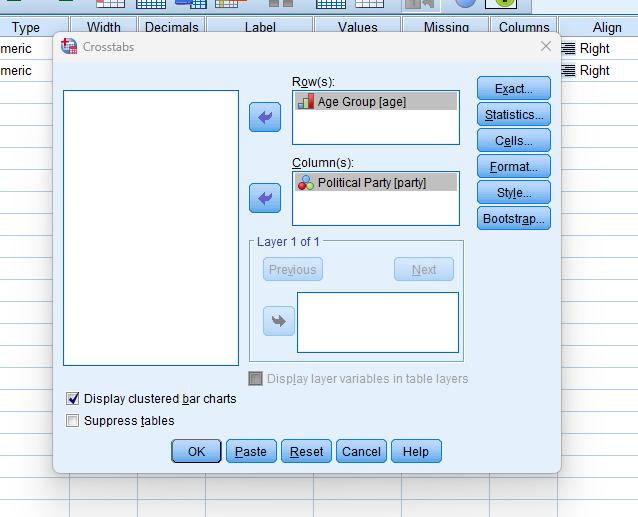 - Assign one variable to the row and the other to the column in the crosstabs dialogue box.