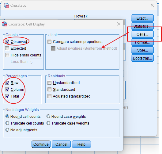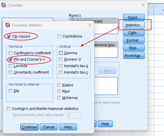 - Choose Chi-Squared: Click on the Statistics button, and select Chi-square to include the test in your output.