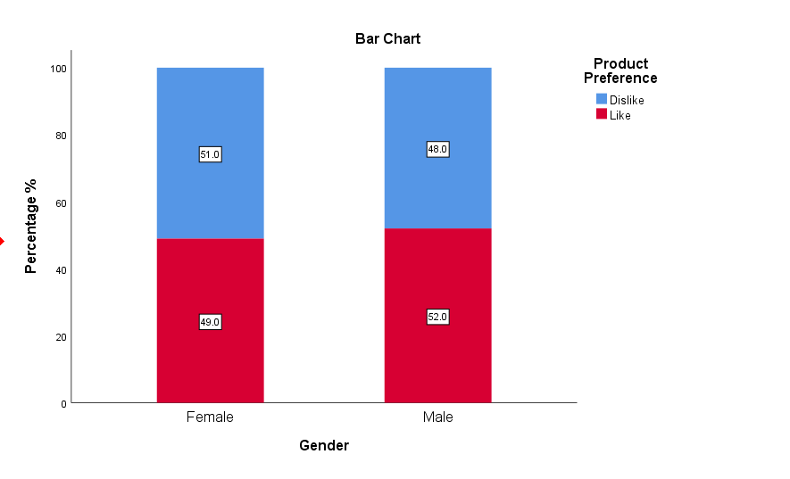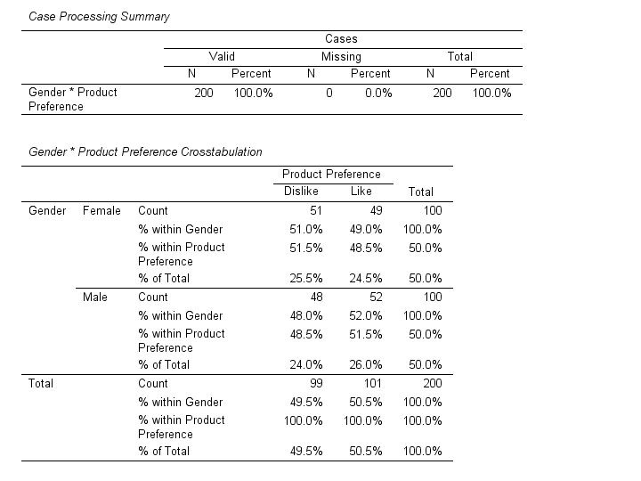 Consider a study investigating the relationship between gender and preference for a new product. The two categorical variables are gender (male and female) and product preference (like and dislike). The researcher collects data from a survey of 200 respondents, cross-tabulating the responses to create a contingency table.