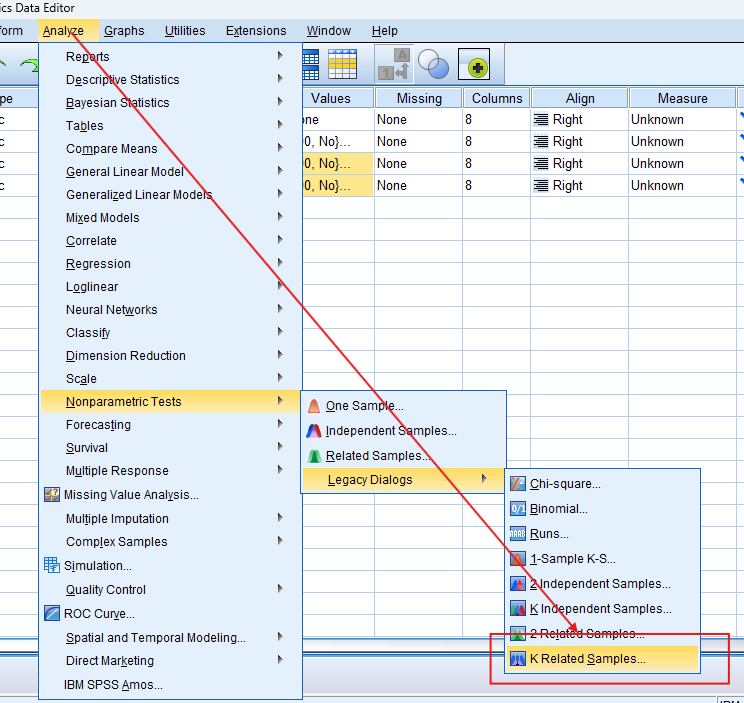 - Select Test: Navigate to `Analyze` > `Nonparametric Tests` > `K Related Samples`.