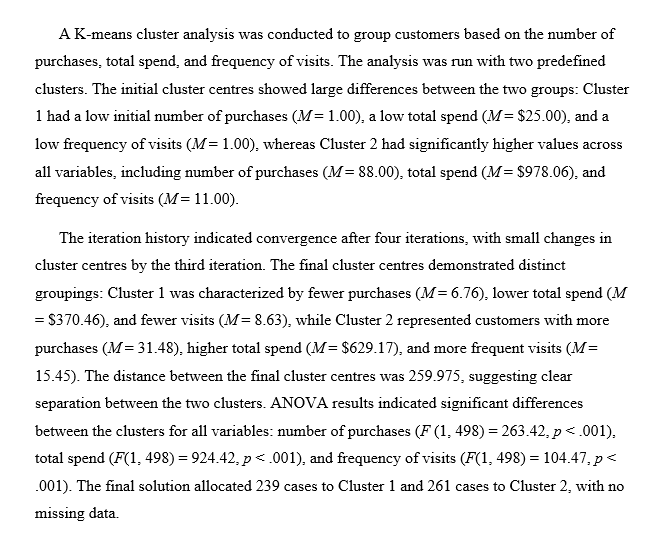 Reporting the results of K-Means Cluster Analysis in APA (American Psychological Association) format requires a structured presentation. Here’s a step-by-step guide in list format: