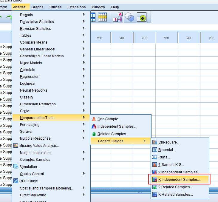 2. Select the Test: Navigate to ‘Analyze’ > ‘Nonparametric Tests’ > ‘K Independent Samples’.