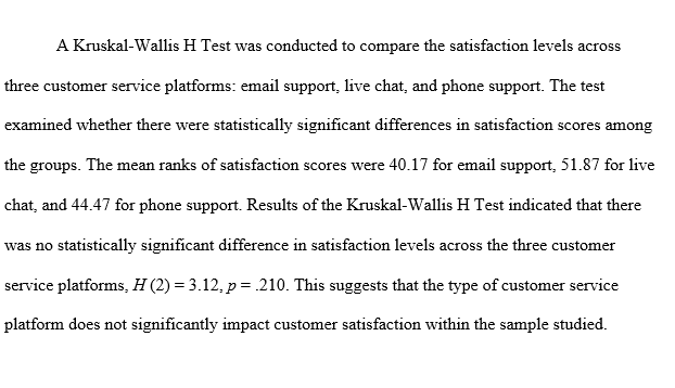 The SPSS output will include the H statistic and a p-value. If the p-value is less than 0.05, we reject the null hypothesis, indicating a significant difference in satisfaction levels across the three platforms. This result would suggest that the type of customer service platform impacts customer satisfaction, providing valuable insights for improving service delivery.