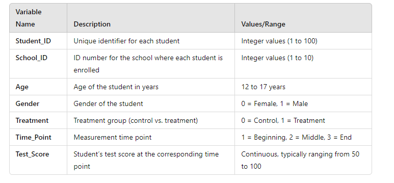 Suppose a researcher is studying the effect of a new educational programme on students’ test scores across 10 schools. We measure test scores at the beginning, middle, and end of the programme. In this scenario, an LMM could account for the hierarchical structure (students nested within schools) and repeated measures (test scores measured at three time points). The model would allow the researcher to examine both the fixed effect of the programme and the random effect of variability between schools.