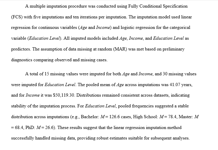 “Missing values in the variable Income were replaced using linear regression imputation in SPSS, using Age and Education Level as predictors.”