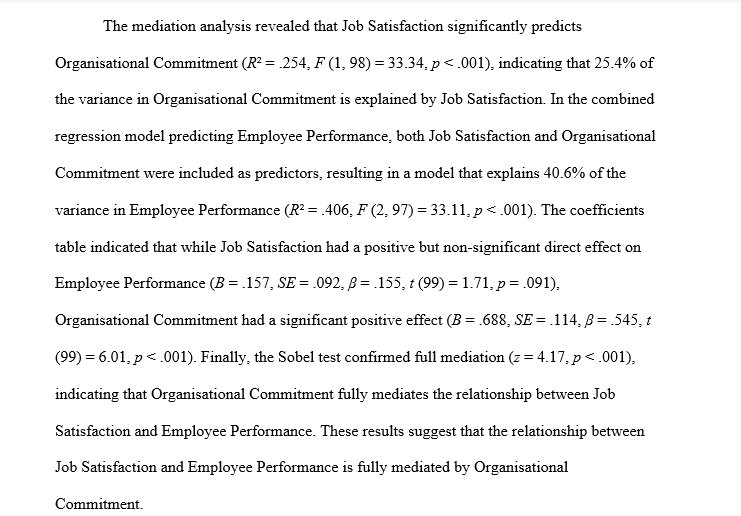 Next, you would demonstrate that organisational commitment significantly affects employee performance, controlling for job satisfaction. Finally, you would compare the direct effect of job satisfaction on employee performance before and after including organisational commitment. If the direct effect diminishes after accounting for organisational commitment, mediation is confirmed, highlighting the mediating role of organisational commitment in this relationship.