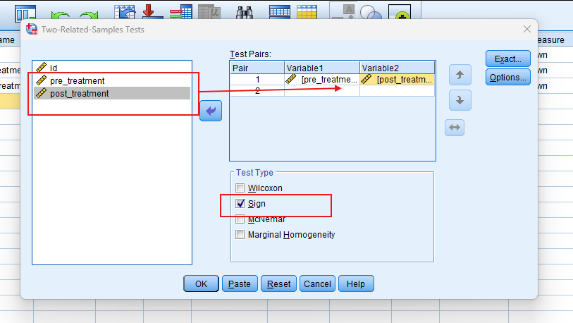 - Choose Variables: In the dialog box, move your paired variables into the Test Pairs box.