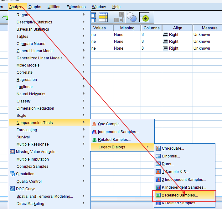 - Select the Test: Navigate to ‘Analyze’ > ‘Nonparametric Tests’ > ‘Legacy Dialogs’ > ‘Related Samples’.