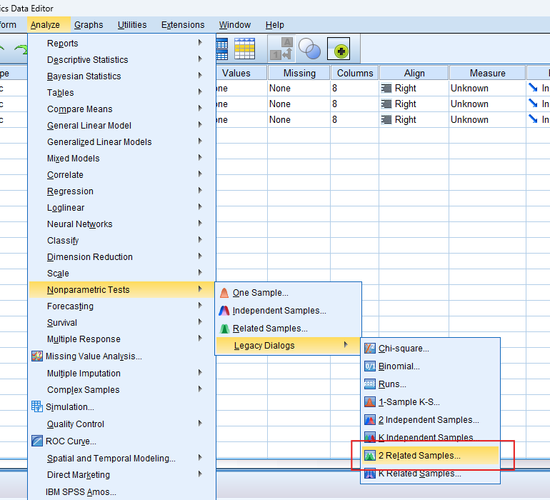 - Select the Test: Navigate to ‘Analyze’ > ‘Nonparametric Tests’ > ‘Legacy Dialogs’ > ‘Related Samples’.